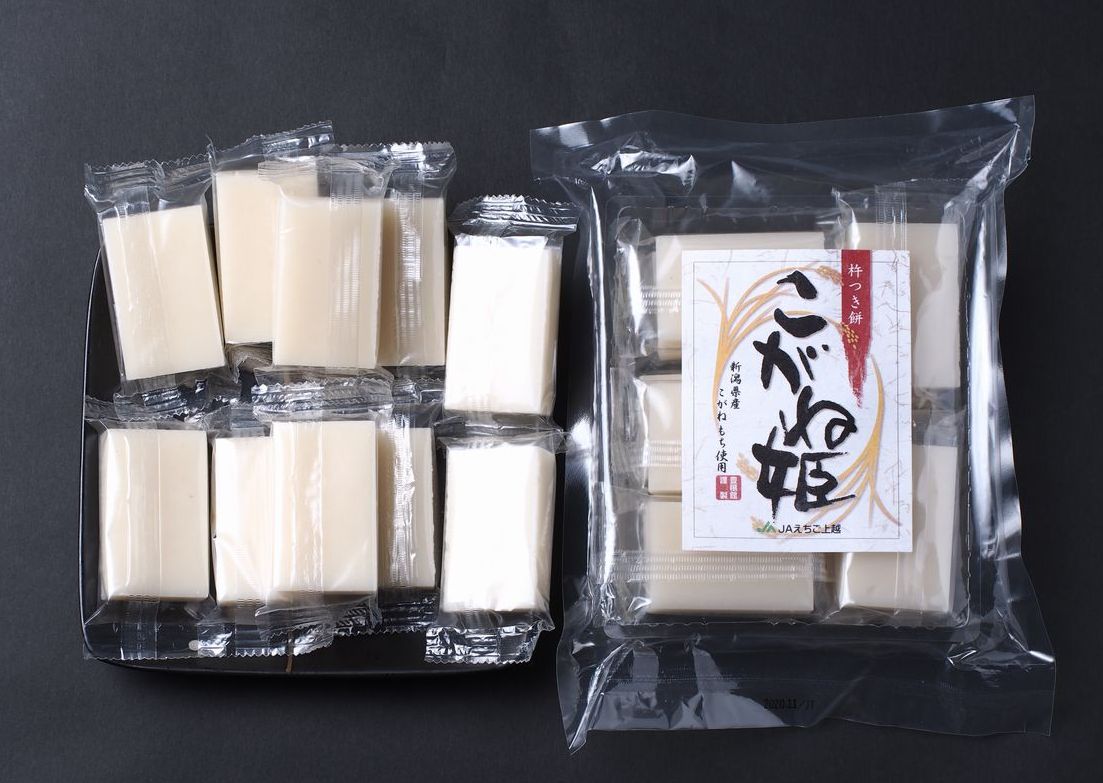 新潟県上越地区産こがねもち(もち米の品種)100%しっかりとした粘りのある、おもちです。