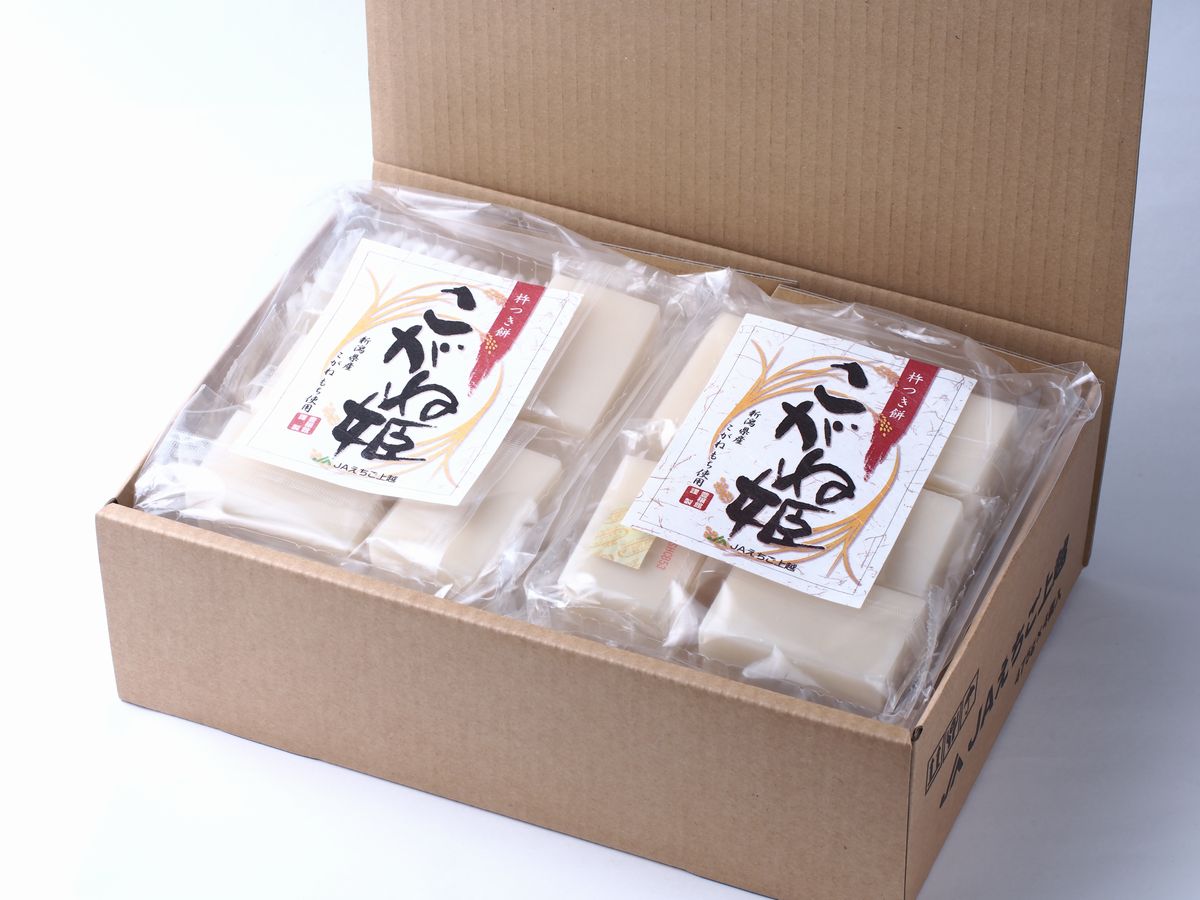 餅ひとつひとつが、パックされています。新潟県産こがねもち(もち米の品種)100%しっかりとした粘りのある、おもちです。